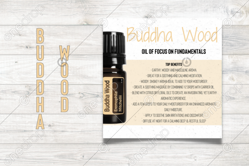 Square infographic with benefits & usage tips of Buddha Wood Essential Oil Blend.