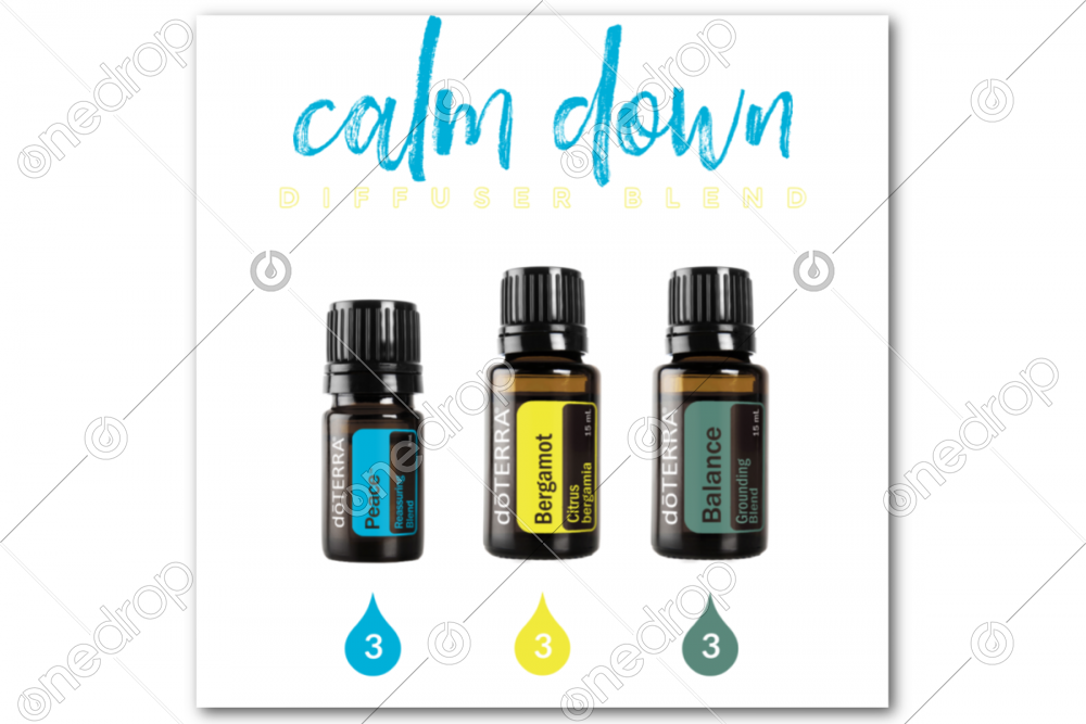This square graphic features the Calm Down diffuser blend recipe with Peace, Bergamot, and Balance.