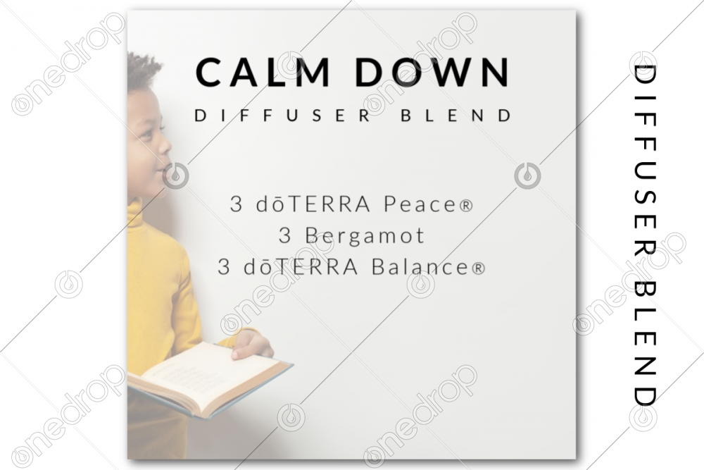 This square graphic features the Calm Down diffuser blend recipe with Peace, Bergamot, and Balance with a photo background.