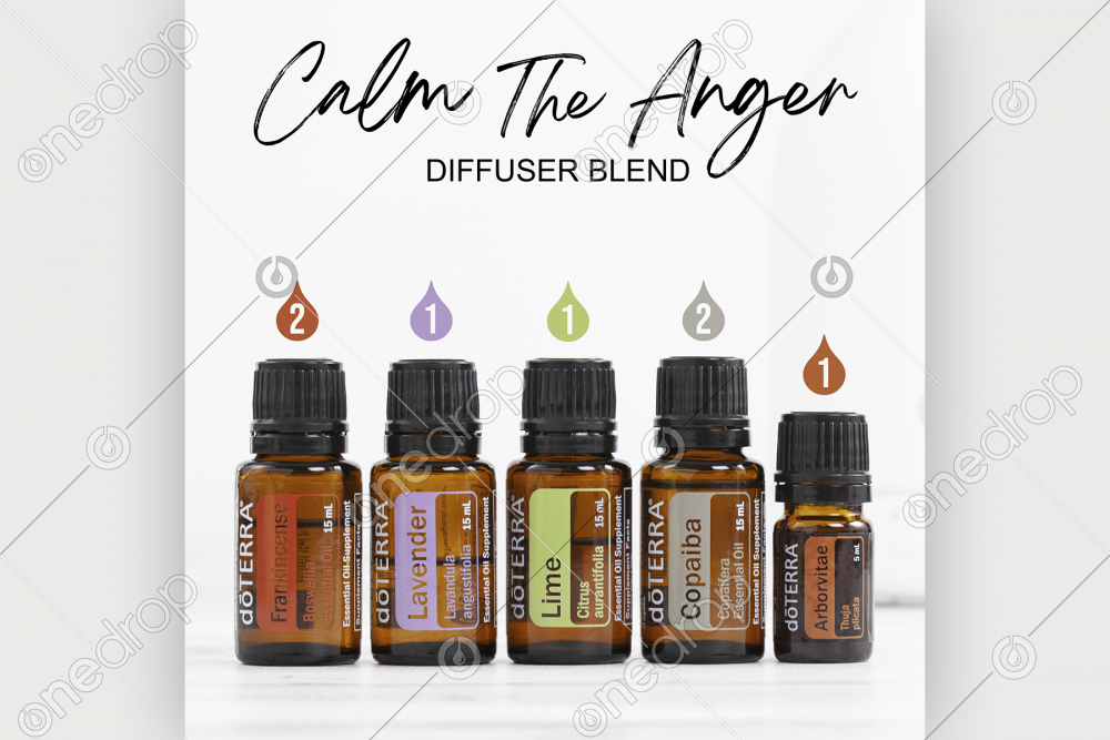 High resolution square picture of the Calm The Anger diffuser blend featuring Frankincense + Copaiba + Lavender + Arborvitae + Lime.