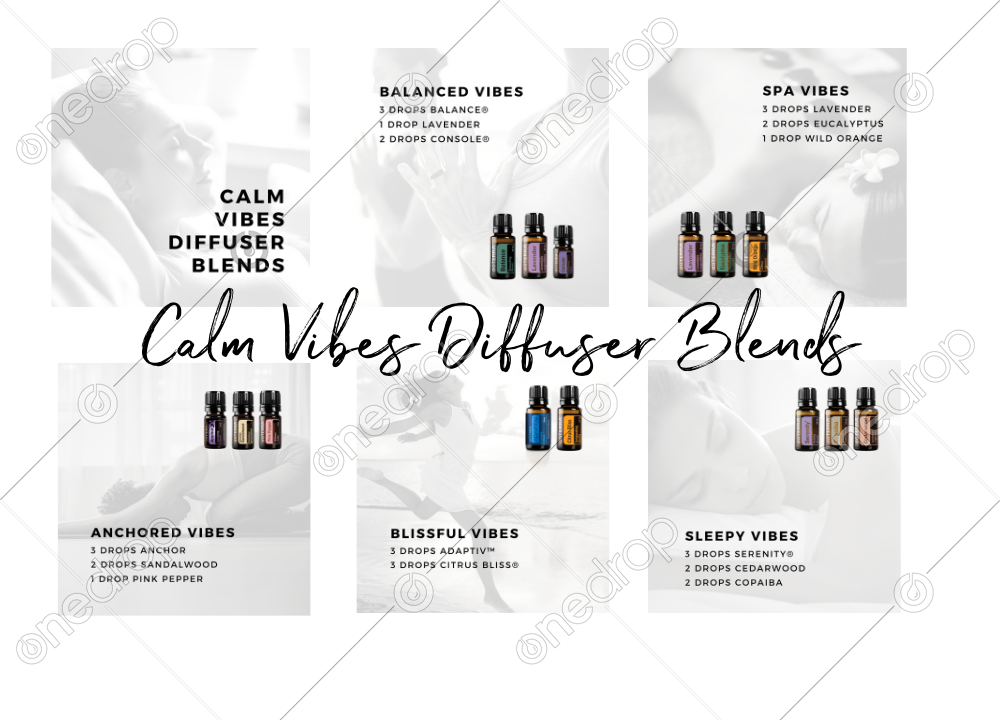 6 Calm Vibes Diffuser Blends Graphics with recipes + oil images.