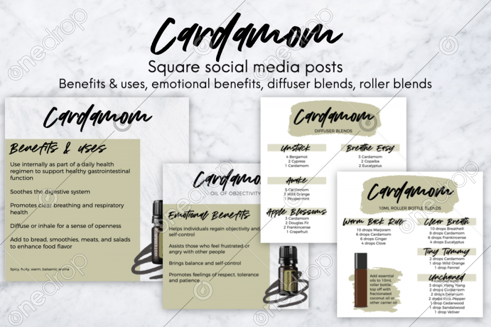 Square post graphics for Cardamom, perfect for social media: Benefits & uses Emotional benefits Diffuser blends Roller bottle blends 4 square graphics **please watermark images to protect your investment If you have a request or comment, please use “provide feedback” to email me. If you want me to address you specifically, please include your contact info for a reply.