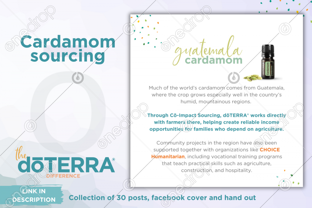 This collection of 30 posts, Facebook cover and handout takes a closer look at the stories behind the oils. From sourcing locations around the world to simple blend ideas you can try at home, it highlights the connection between essential oils, the communities who grow them, and the ways we can give back.