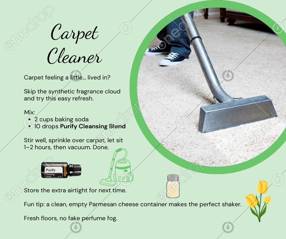Stir well, sprinkle over carpet, let sit 1–2 hours, then vacuum. Done. 🙌