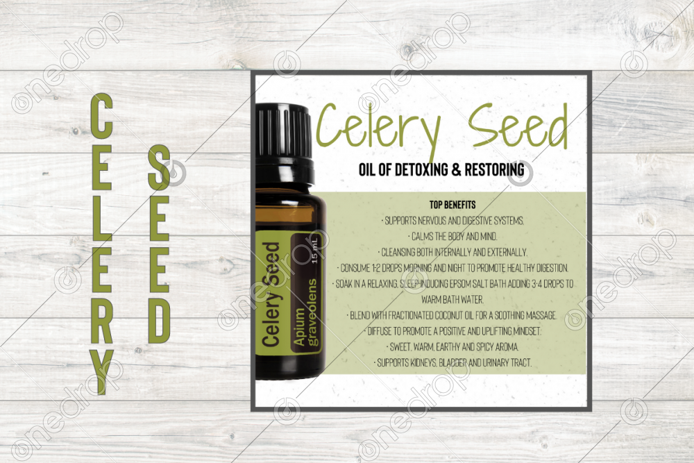 Square infographic with benefits & usage tips of Celery Seed Essential Oil.