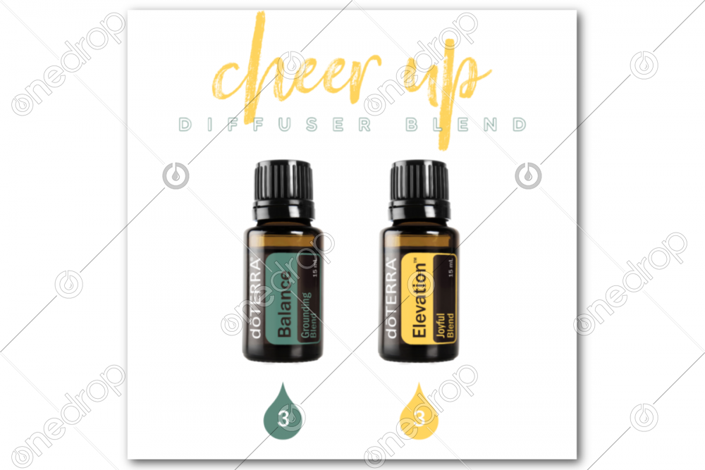 This square graphic features the Cheer Up diffuser blend recipe with Balance and Elevation.