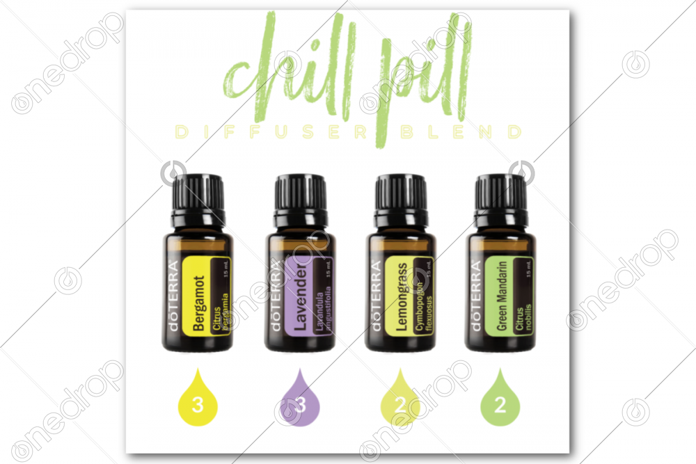 This square graphic features the Chill Pill diffuser blend recipe with Bergamot, Lavender, Lemongrass, and Green Mandarin.