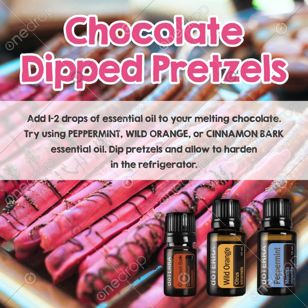 Chocolate Dipped Pretzels with peppermint, wild orange, or cinnamon bark.