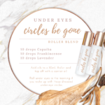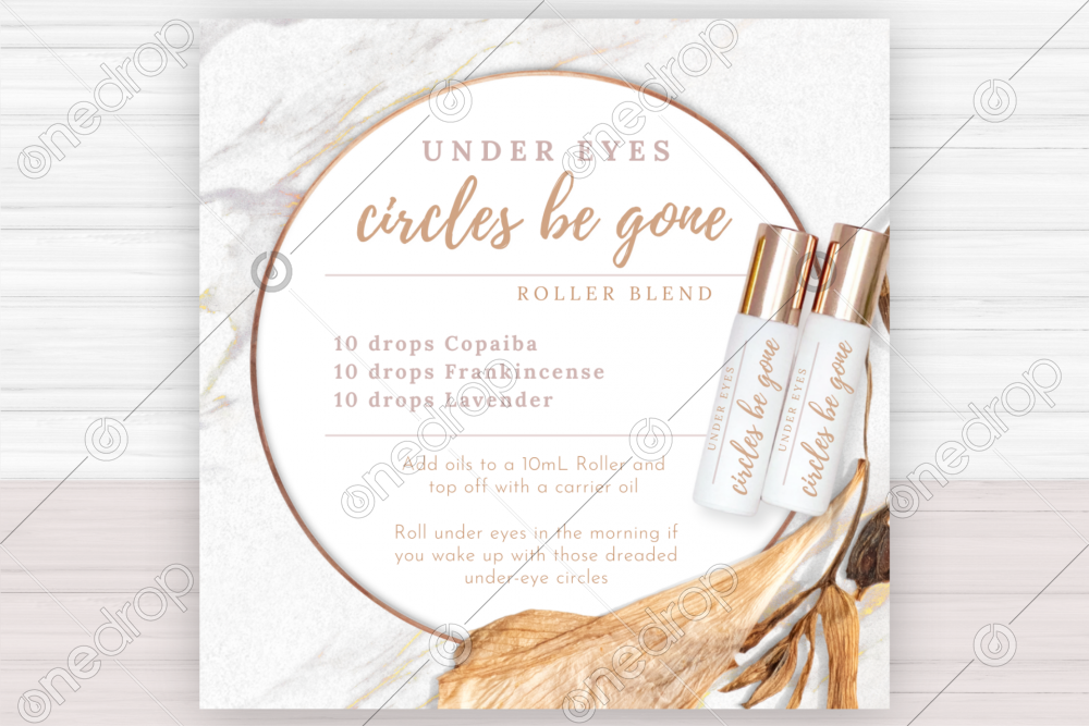 - Roller blend recipe with image of 2 white glass 10mL rollers with rose gold caps and custom labels, soft marble background, and flat-lay dried florals
