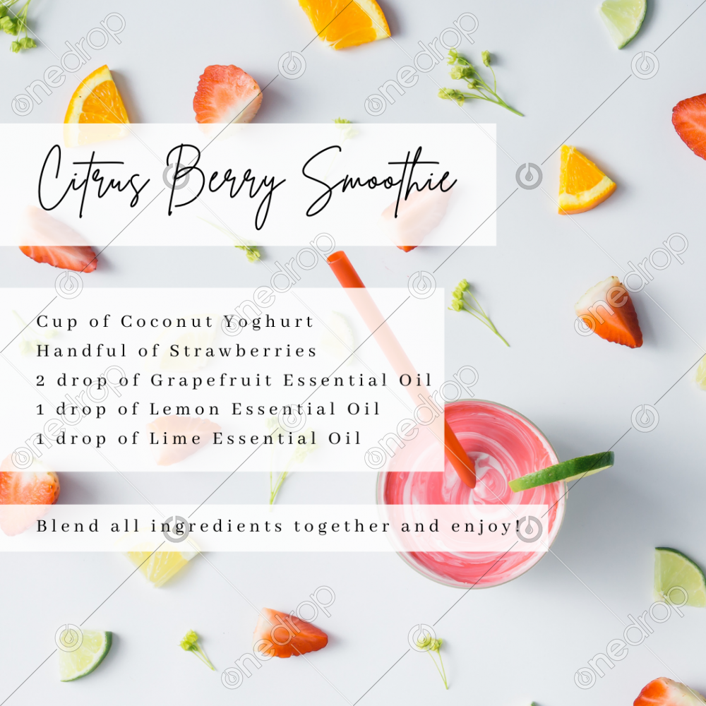 Citrus Berry smoothie with coconut yoghurt, strawberries, grapefruit, lemon, lime, mint and ice