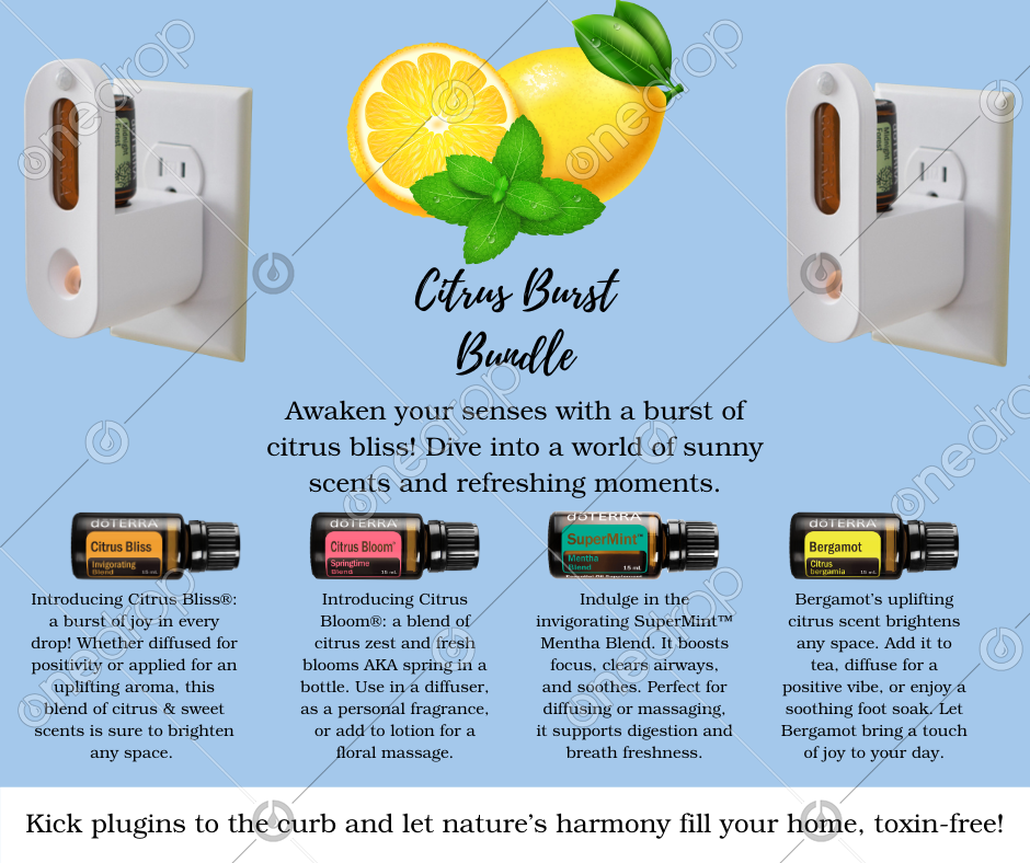 Citrus Burst Bundle – Say goodbye to artificial plugins and welcome the pure essence of nature into your home, completely toxin-free! This bundle combines the bright, cheerful aromas of citrus and mint to create a harmonious, uplifting atmosphere. Let these natural scents fill your space, transforming your home into a refreshing haven with every drop.