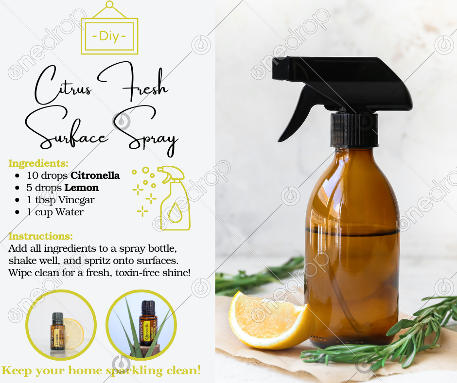 Keep your home sparkling clean with this fresh and powerful DIY surface spray! The zesty combination of Citronella and Lemon helps cleanse surfaces while leaving a bright, uplifting scent.