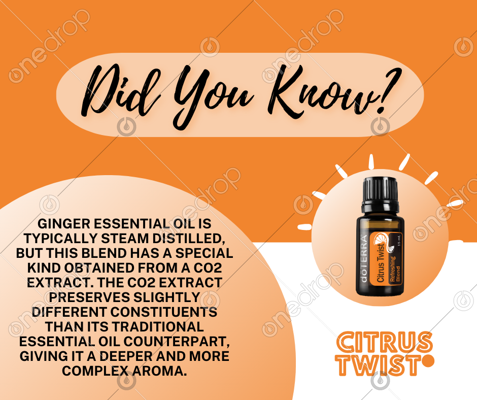 Hey there, citrus enthusiasts! 🍊 Did you know our Citrus Twist blend has a little secret twist? 🌀 It's not your average citrus oil—it's got a CO2 extract of ginger! 🌟 Yep, that's right! It's like the VIP of citrus oils, with a deeper and more complex aroma that'll make your senses do a happy dance. ✨ So, next time you're in need of a citrusy pick-me-up, reach for Citrus Twist and let the CO2 magic do its thing! 🎉