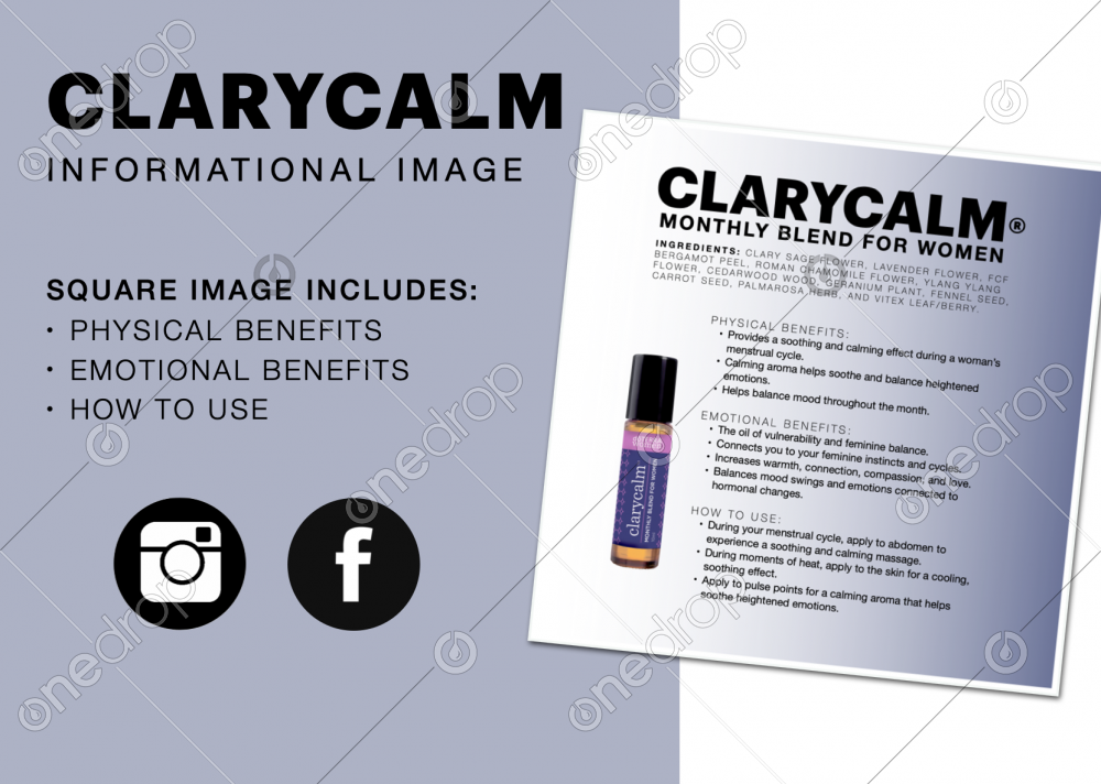 Square Social Media Image with Physical Benefits, Emotional Benefits + How to Use for ClaryCalm Essential Oil