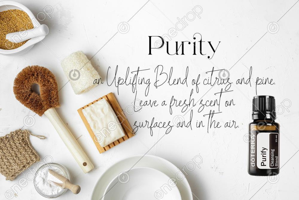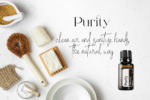 A background image supporting the essential oil, Purity, touting its cleaning and sanitizing uses. Three separate social media posts picture the doTerra oil. One post leaves space to add personalized copy.