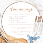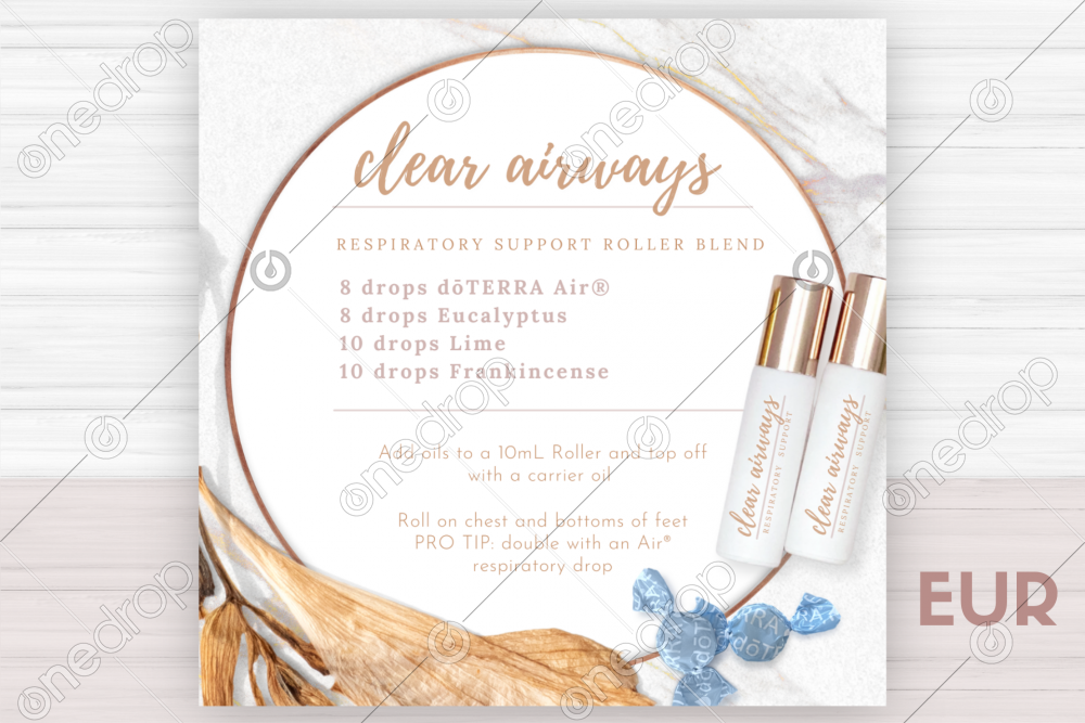 - Roller blend recipe with image of 2 white glass 10mL rollers with rose gold caps and custom labels, dōTERRA Air® Drops, soft marble background, and flat-lay dried florals