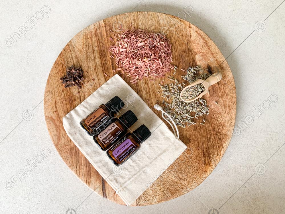 Lavender, Clove and Cedarwood Essential Oils laid on a calico bag placed on top of a round wooden board with fresh cedarwood, lavender and clove herbs.