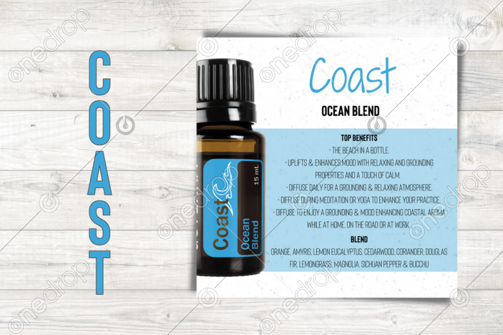 Square infographic with benefits & usage tips of Coast Essential Oil Blend.