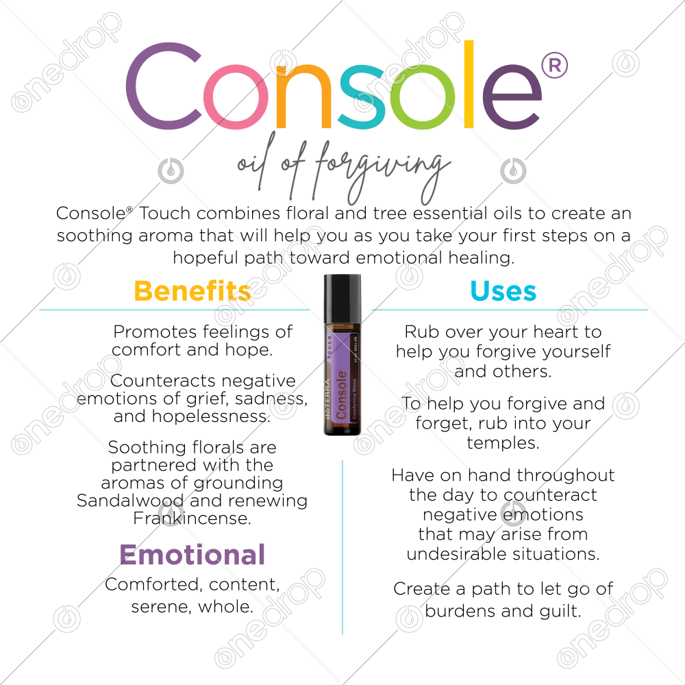doTERRA Console was created to promote feelings of comfort and hope. Soothing floral essential oils are partnered with the aromas of grounding Sandalwood and renewing Frankincense. Apply the blend over your heart or diffuse for aromas that encourage hopefulness.