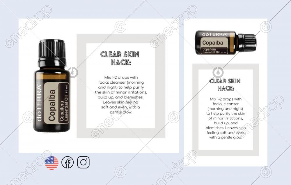 File download includes two graphic images: One square post (with matching stories post) displaying image of oil with a topical usage tip (to help clear and smooth skin).