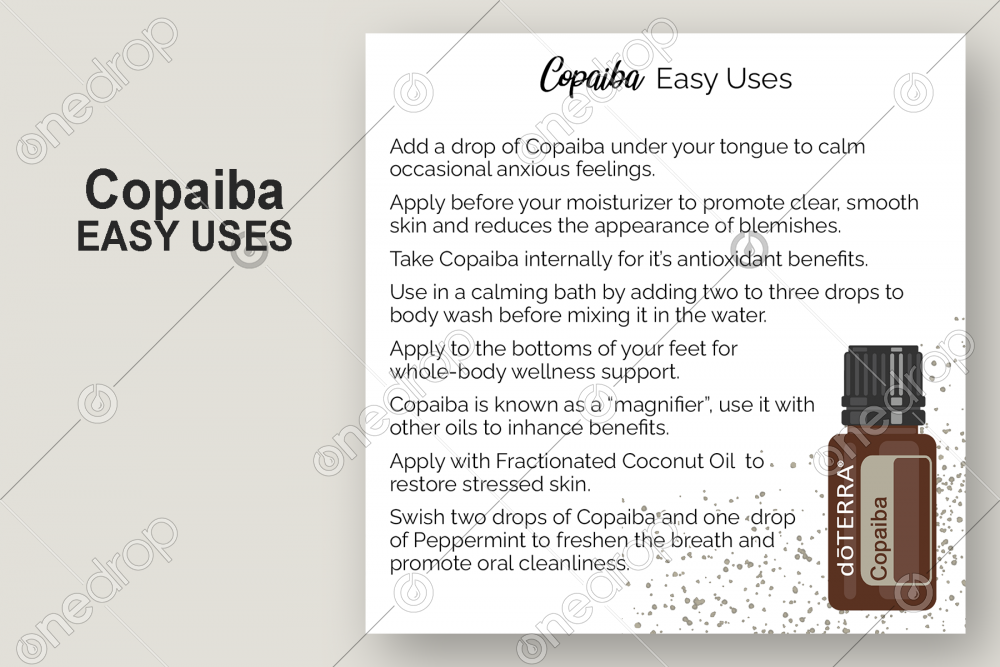 This image shares 8 easy uses for Copaiba with illustrated bottle. 📌Please make sure to watermark images with your name/logo to protect your investment and make sure One Drop contributors are fairly compensated for their work and direct your sharers back to One Drop to download their own 😀