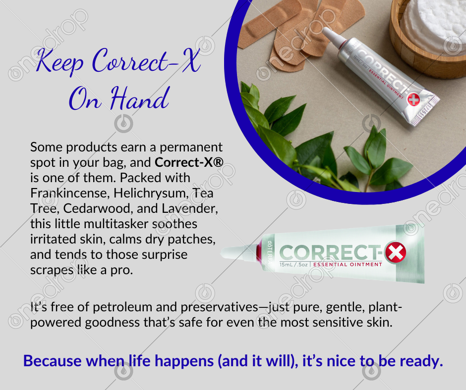 Meet your skin’s new best friend! 🌿 Correct-X® is a natural, powerhouse ointment loaded with Frankincense, Helichrysum, Tea Tree, Cedarwood, and Lavender—all beloved for their skin-soothing magic.