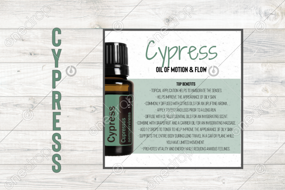 Square infographic with benefits & usage tips of Cypress Essential Oil.