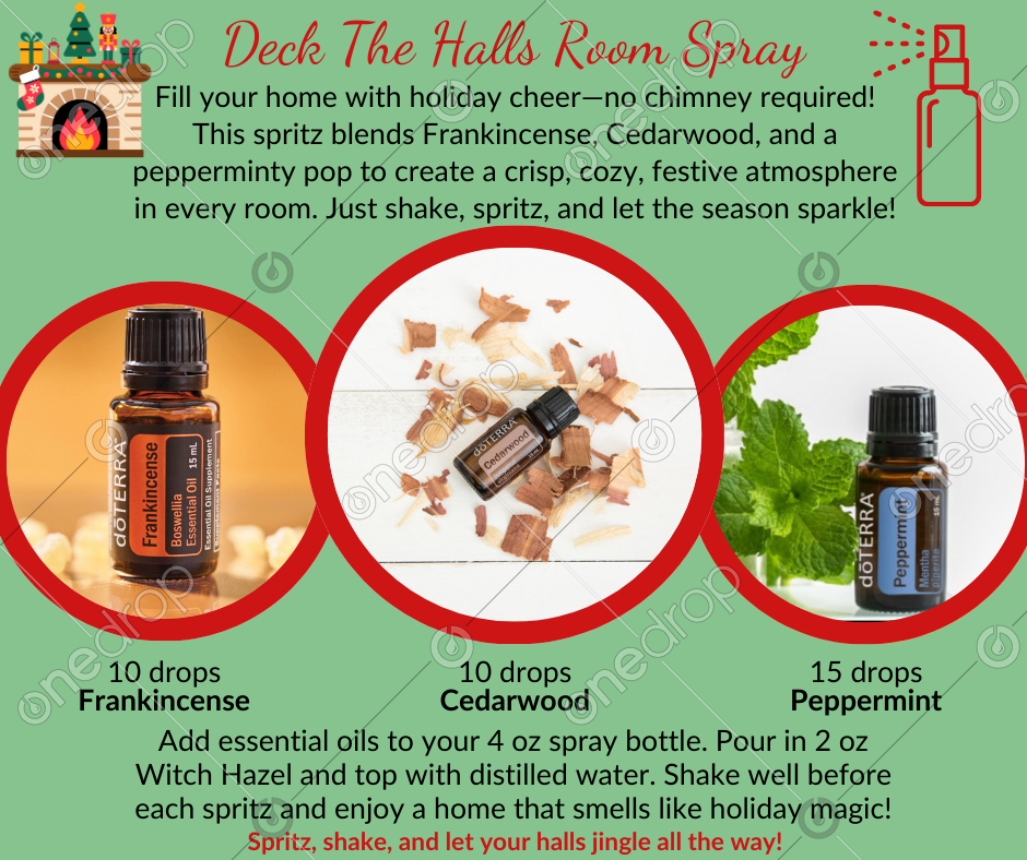 Fill your home with holiday cheer—no chimney required! This spritz blends Frankincense, Cedarwood, and a pepperminty pop to create a crisp, cozy, festive atmosphere in every room. Just shake, spritz, and let the season sparkle!