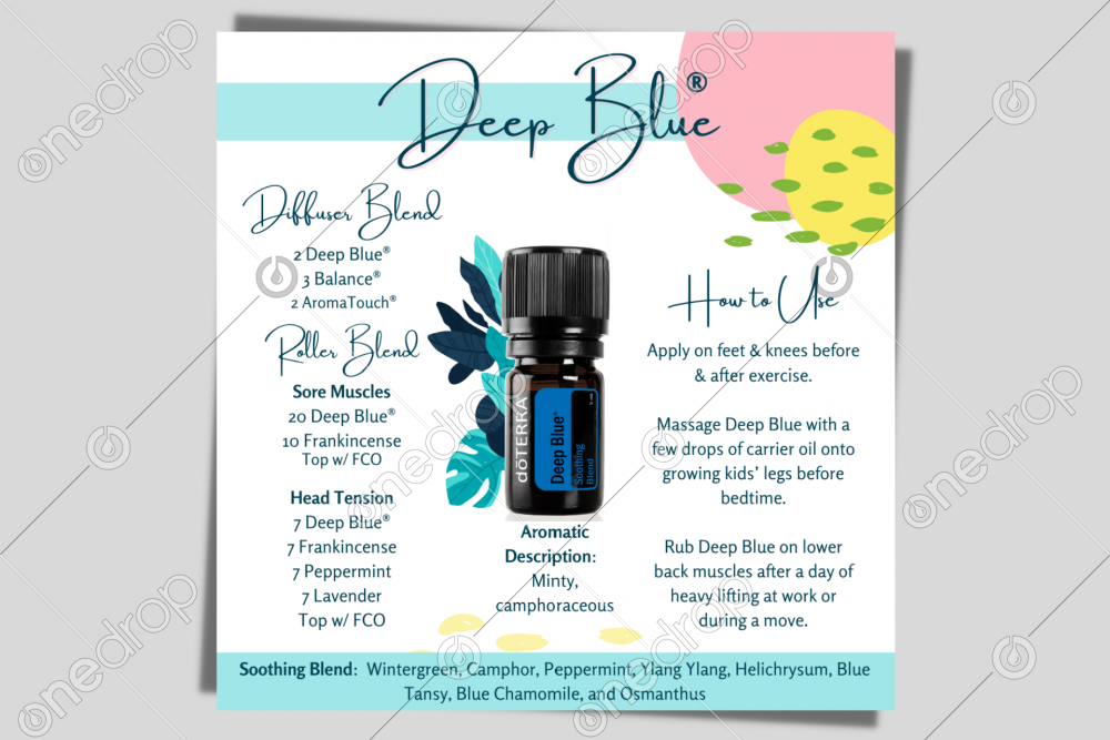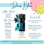 One image of Deep Blue® giving description of how to use the oil, diffuser blend and roller blends.