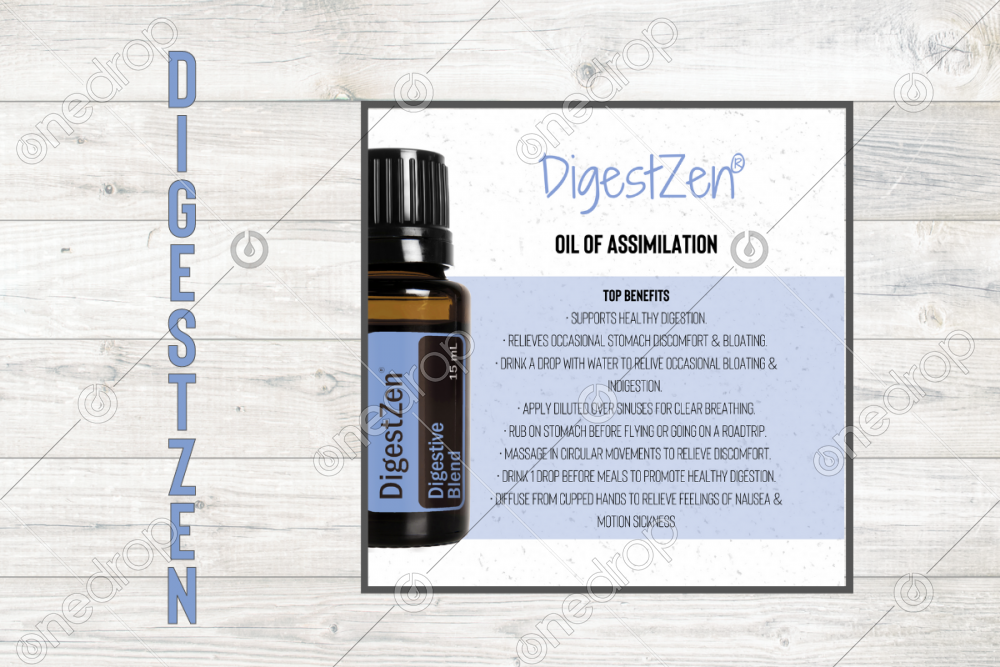 Square infographic with benefits & usage tips of DigestZen Essential Oil.