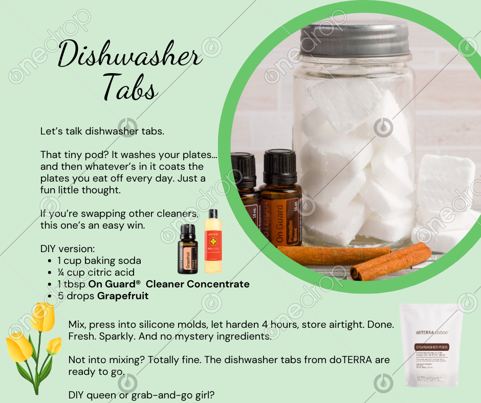 Not into mixing? Totally fine. The dishwasher tabs from doTERRA are ready to go.