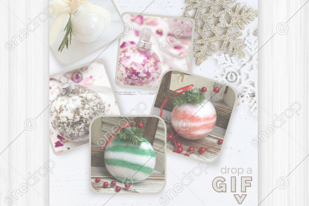 - Flat lay, white wood background with gold and white snowflakes, multiple images of ornaments filled with bath salts
