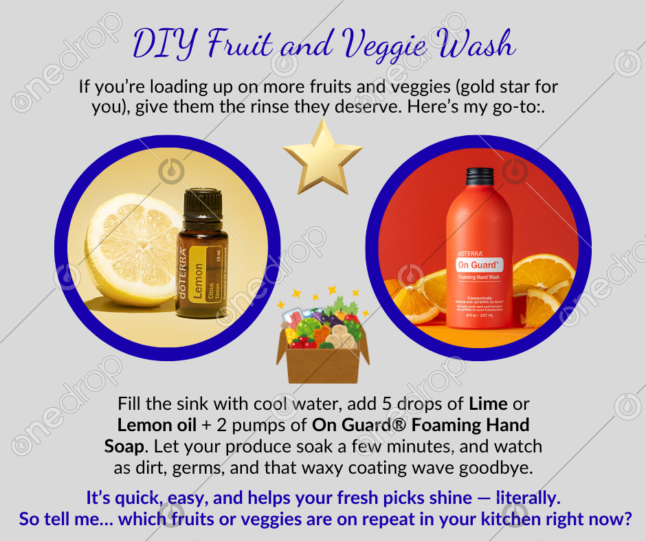 The essential oils help cleanse produce of unwanted germs and lift away that waxy coating often found on store-bought fruits and veggies. Simple, effective, and no mystery ingredients involved.