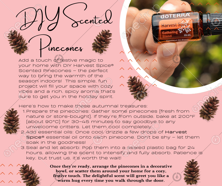 Add essential oils: Once cool, drizzle a few drops of Harvest Spice essential oil onto each pinecone. Don't be shy – let them soak in the goodness! 🌲🌿