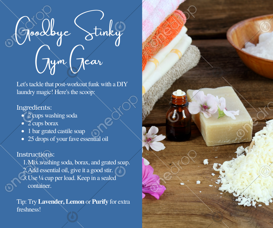 Tired of stinky workout gear? Let's whip up some homemade laundry detergent! With just a few ingredients and a splash of essential oil, your clothes will smell fresher than ever! Check out the recipe below and say goodbye to funky odors for good!