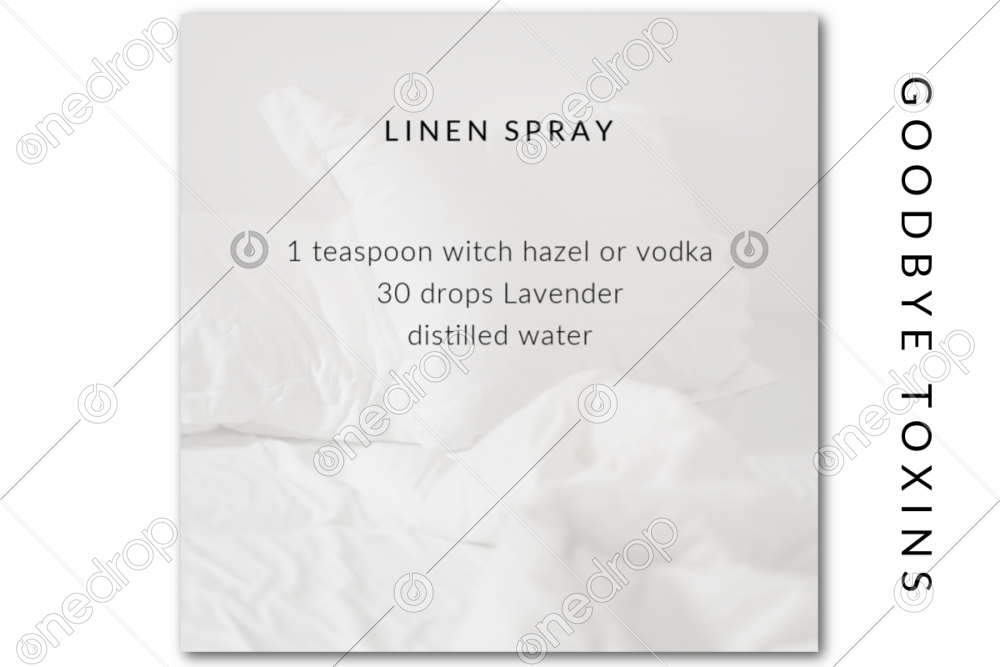 Add witch hazel, water, and essential oil into a 2 oz spray bottle and spray linens!