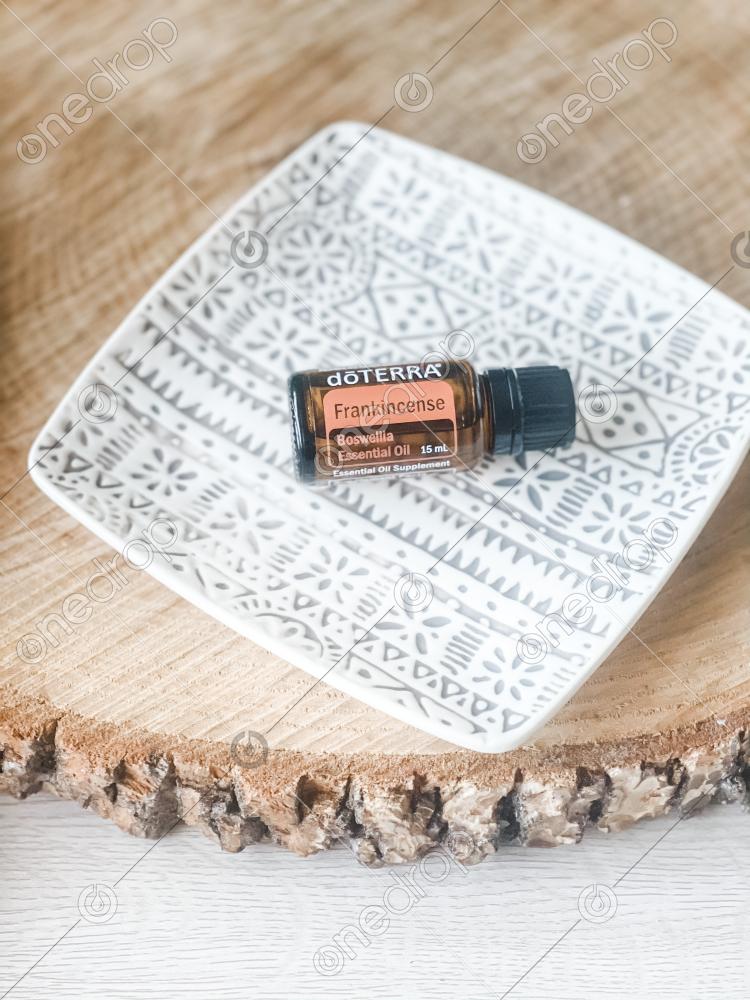 dōTERRA Frankincense single oil Bottle on Boho pattern ceramic plate & rustic wood stand