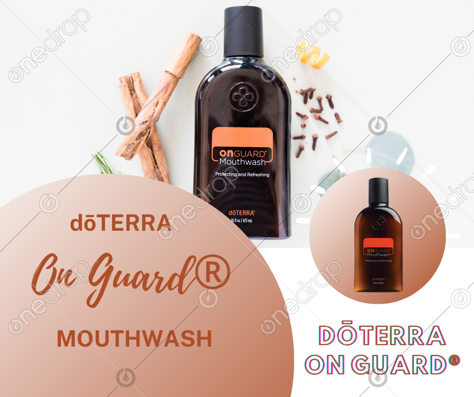 doTERRA On Guard™ Mouthwash is alcohol-free and formulated to clean teeth and gums, reduce plaque, and promote a healthy–looking mouth when used as part of a hygiene routine that includes brushing and flossing.Fonts: