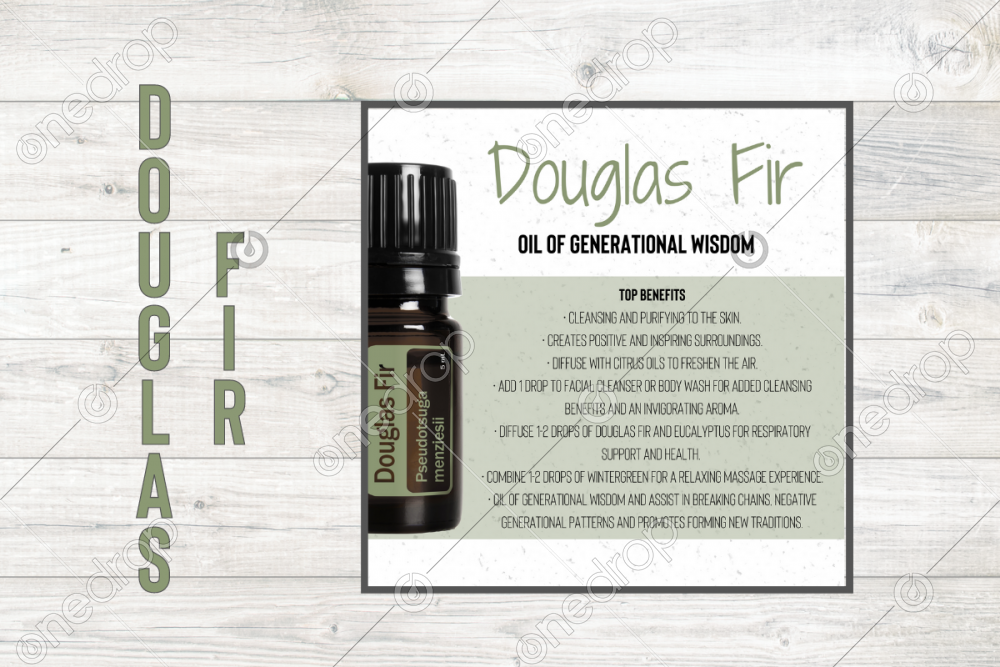 Square infographic with benefits & usage tips of Douglas Fir Essential Oil.