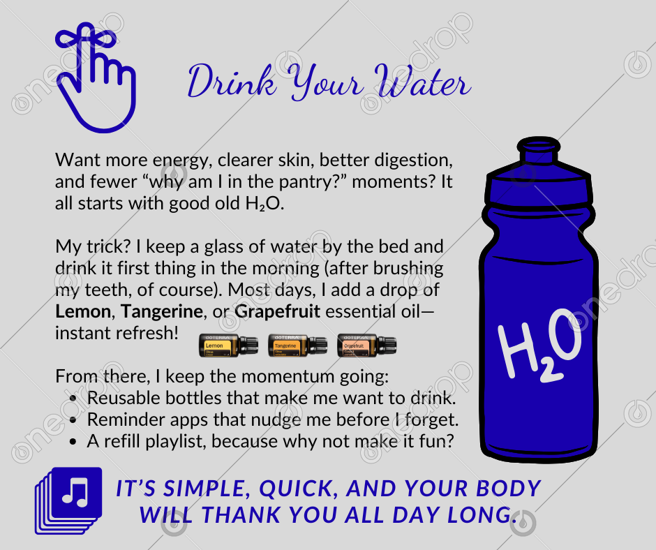 Keep a glass by your nightstand. After brushing your teeth, add 1 drop of your favorite citrus oil—Lemon, Tangerine, or Grapefruit—and sip your way into hydration bliss. A refreshing start that counts toward your daily goal!