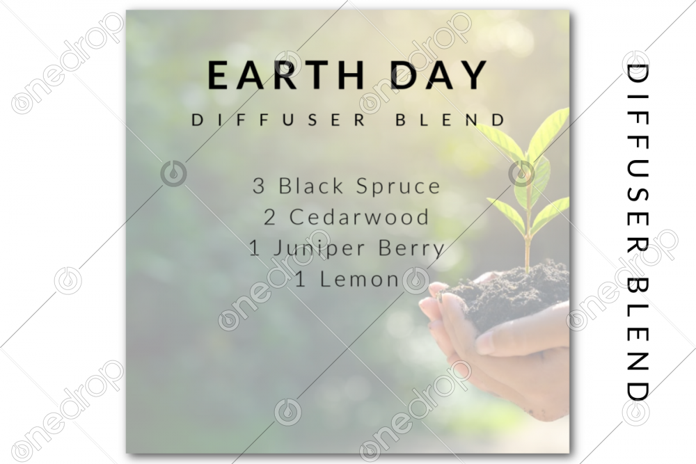 This square graphic features the Earth Day diffuser blend recipe with Black Spruce, Cedarwood, Juniper Berry, and Lemon with a photo background.
