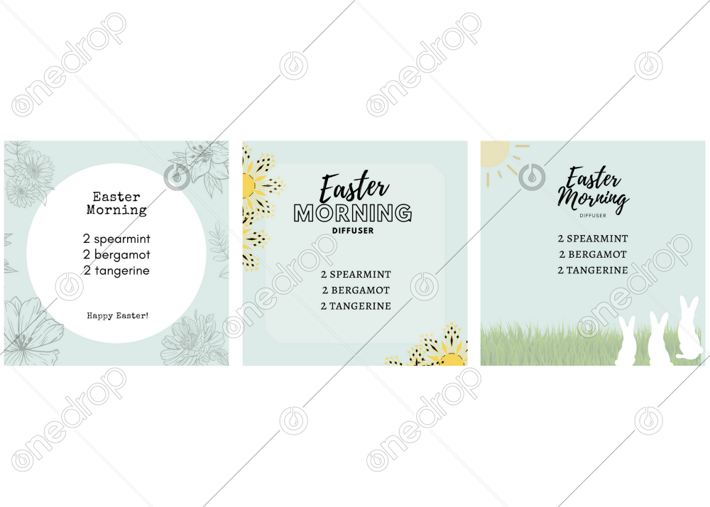 High resolution square format Easter blend diffuser recipe with three different backgrounds. Download includes backgrounds with title only so that different blends can be inserted.