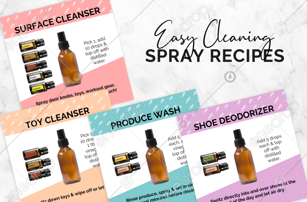 Four awesome spray recipes for cleaning: Surfaces, Toys, Produce & Shoes.