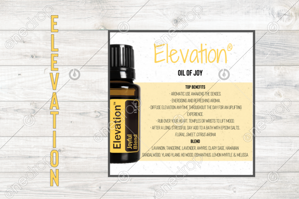 Square infographic with benefits & usage tips of Elevation Essential Oil.