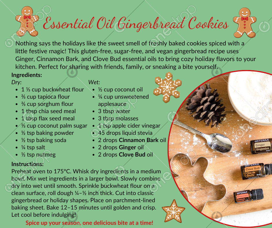 Nothing says the holidays like the sweet smell of freshly baked cookies spiced with a little festive magic! This gluten-free, sugar-free, and vegan gingerbread recipe uses Ginger, Cinnamon Bark, and Clove Bud essential oils to bring cozy holiday flavors to your kitchen. Perfect for sharing with friends, family, or sneaking a bite yourself. 😉