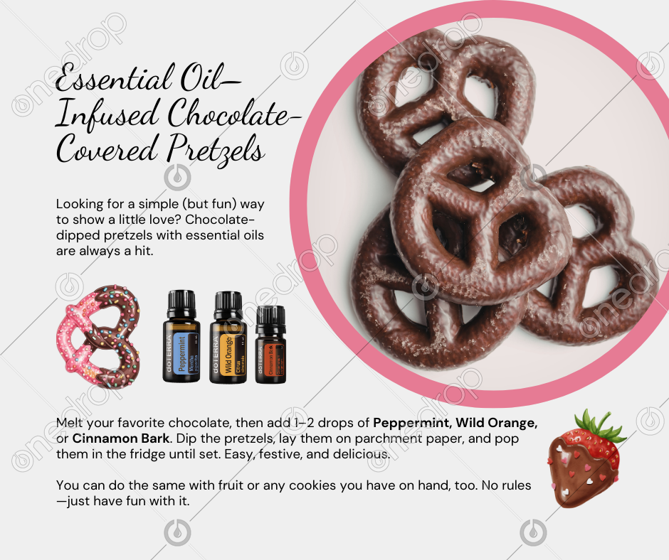 Looking for a simple (but fun) way to show a little love? Chocolate-dipped pretzels with essential oils are always a hit.