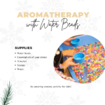 How to: Mix together your oil of choice with your water (try 1 drop of essential oil per 1 cup of water). Pour water beads into a bucket and add the water/essential oil mixture. It will take a few minutes for the beads to expand. Scoop the beads or run them through your fingers.