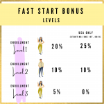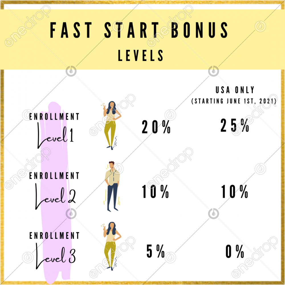 The Fast Start Bonus is the only commission paid out weekly. All other bonuses are paid out on a monthly basis. Enrollers will earn commission up to three levels. The enroller of the enroller will earn 10 percent, while their enroller will earn five percent.