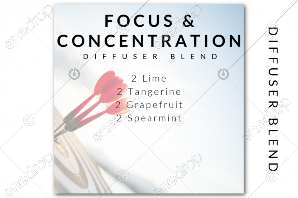 This square graphic features the Focus & Concentration diffuser blend recipe with Lime, Tangerine, Grapefruit, and Spearmint with a photo background.