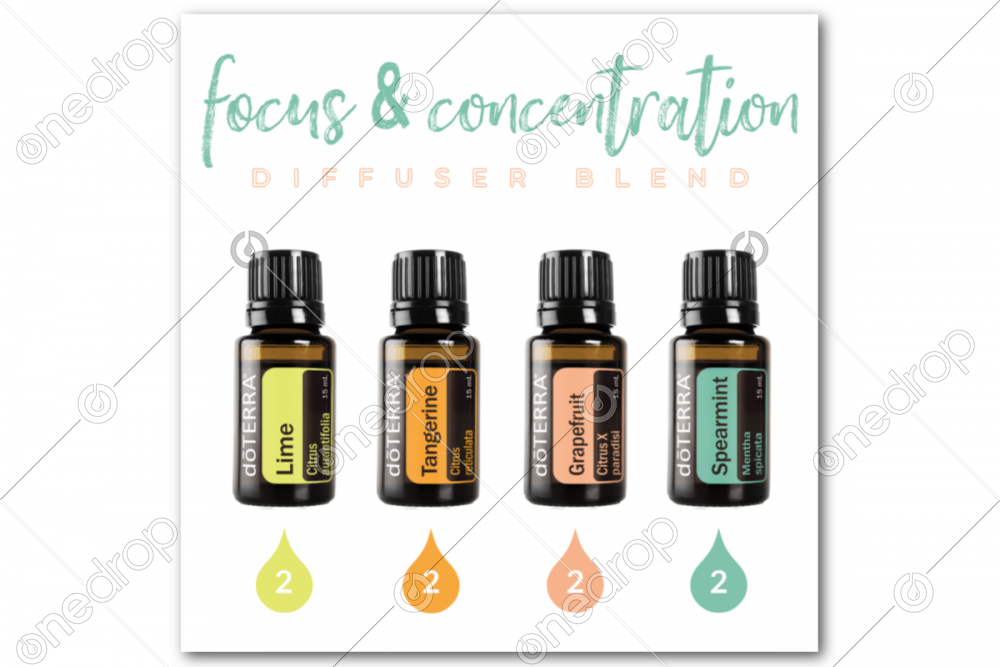 This square graphic features the Focus & Concentration diffuser blend recipe with Lime, Tangerine, Grapefruit, and Spearmint.
